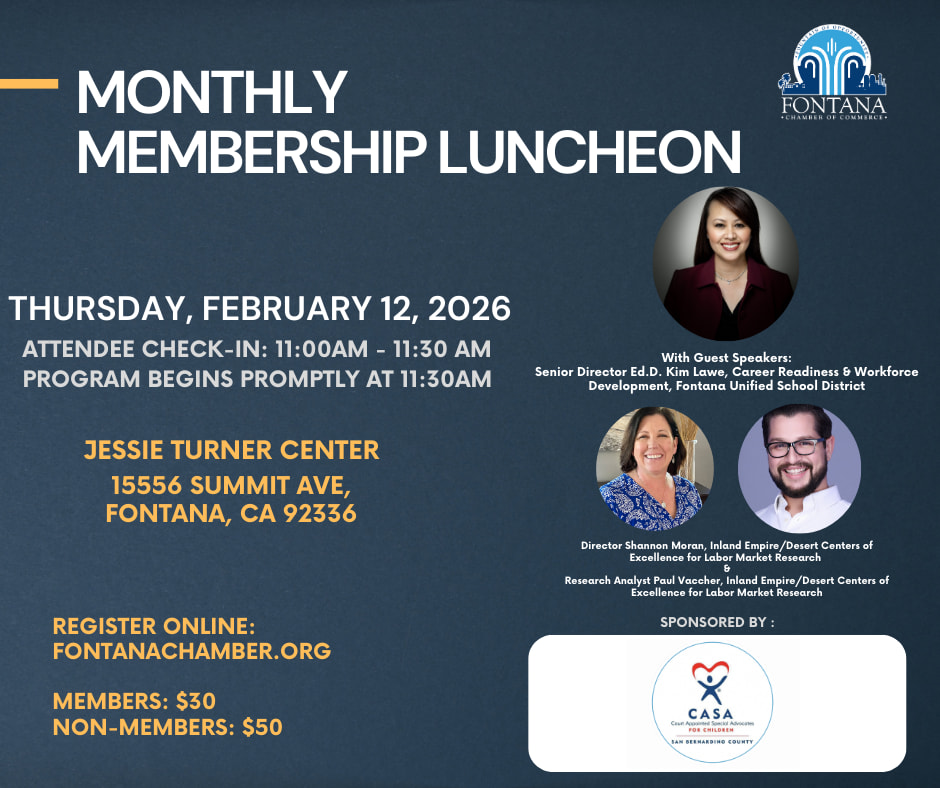 We are thrilled to create a platform for you to network with other businesses and meet with local dignitaries! Thank you to our February 2026 Luncheon Sponsor, C.A.S.A. San Bernardino County!