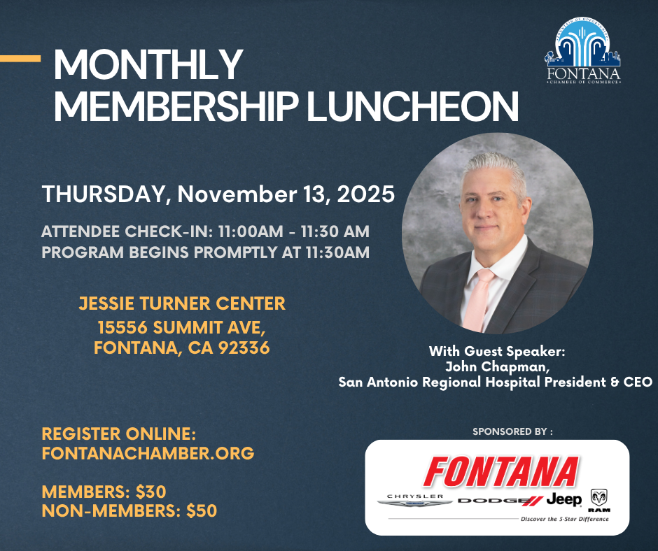 We are thrilled to create a platform for you to network with other businesses and meet with local dignitaries! Thank you to our sponsor Fontana Chrysler, Dodge, Jeep, and Ram!