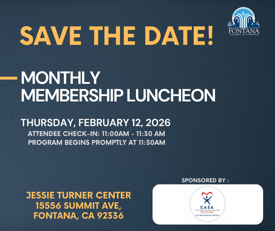 We are thrilled to create a platform for you to network with other businesses and meet with local dignitaries! Thank you to our February 2026 Luncheon Sponsor, C.A.S.A. San Bernardino County!