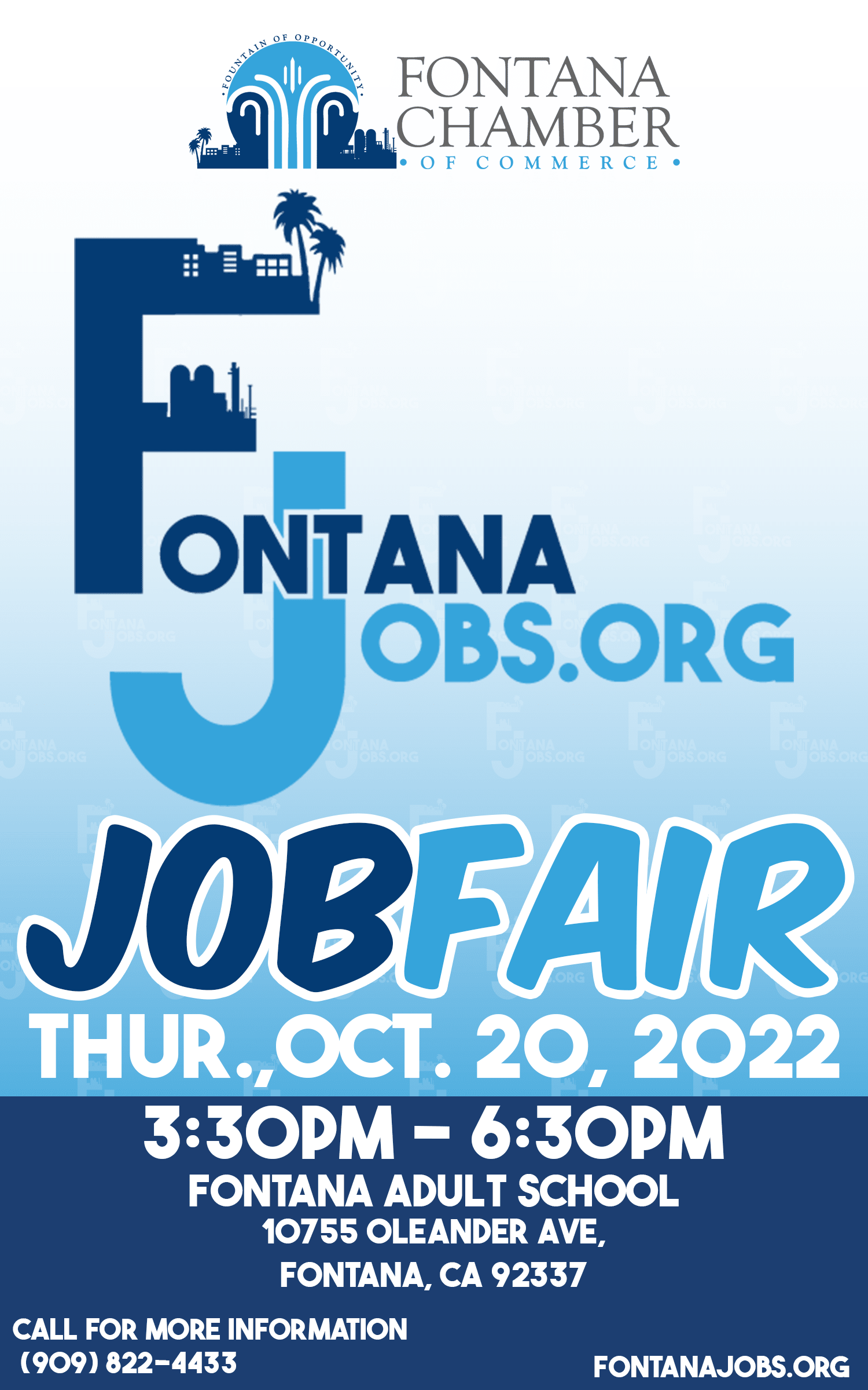 Job Fair Date: October 20, 2022, Time 3:30 pm - 6:30 pm Location: Fontana Adult School, 10755 Oleander Ave, Fontana, CA 92337, Please call us at (909) 822-4433 if would you like to participate as a vendor, or email us at jobs@fontanachamber.org
