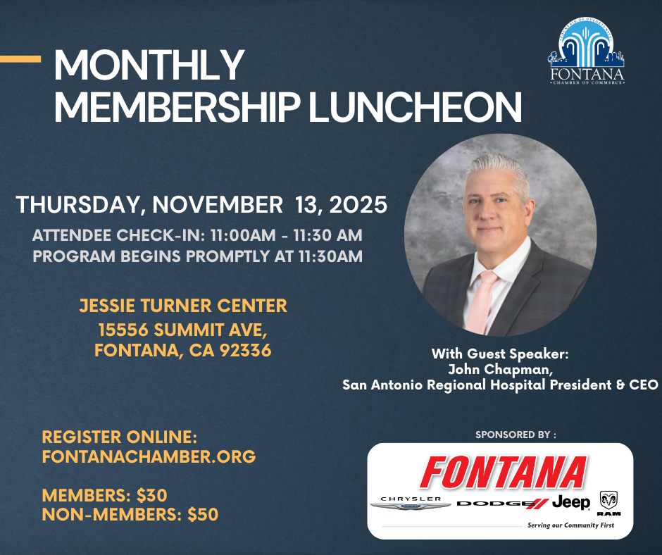 We are thrilled to create a platform for you to network with other businesses and meet with local dignitaries! Thank you to our sponsor Fontana Chrysler, Dodge, Jeep, and Ram! Our speaker for this luncheon will be San Antonio Regional Hospital President & CEO, John Chapman!
