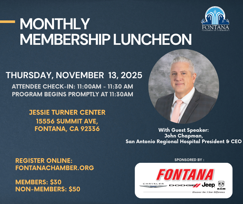 We are thrilled to create a platform for you to network with other businesses and meet with local dignitaries! Thank you to our sponsor Fontana Chrysler, Dodge, Jeep, and Ram! Our speaker for this luncheon will be San Antonio Regional Hospital President & CEO, John Chapman!