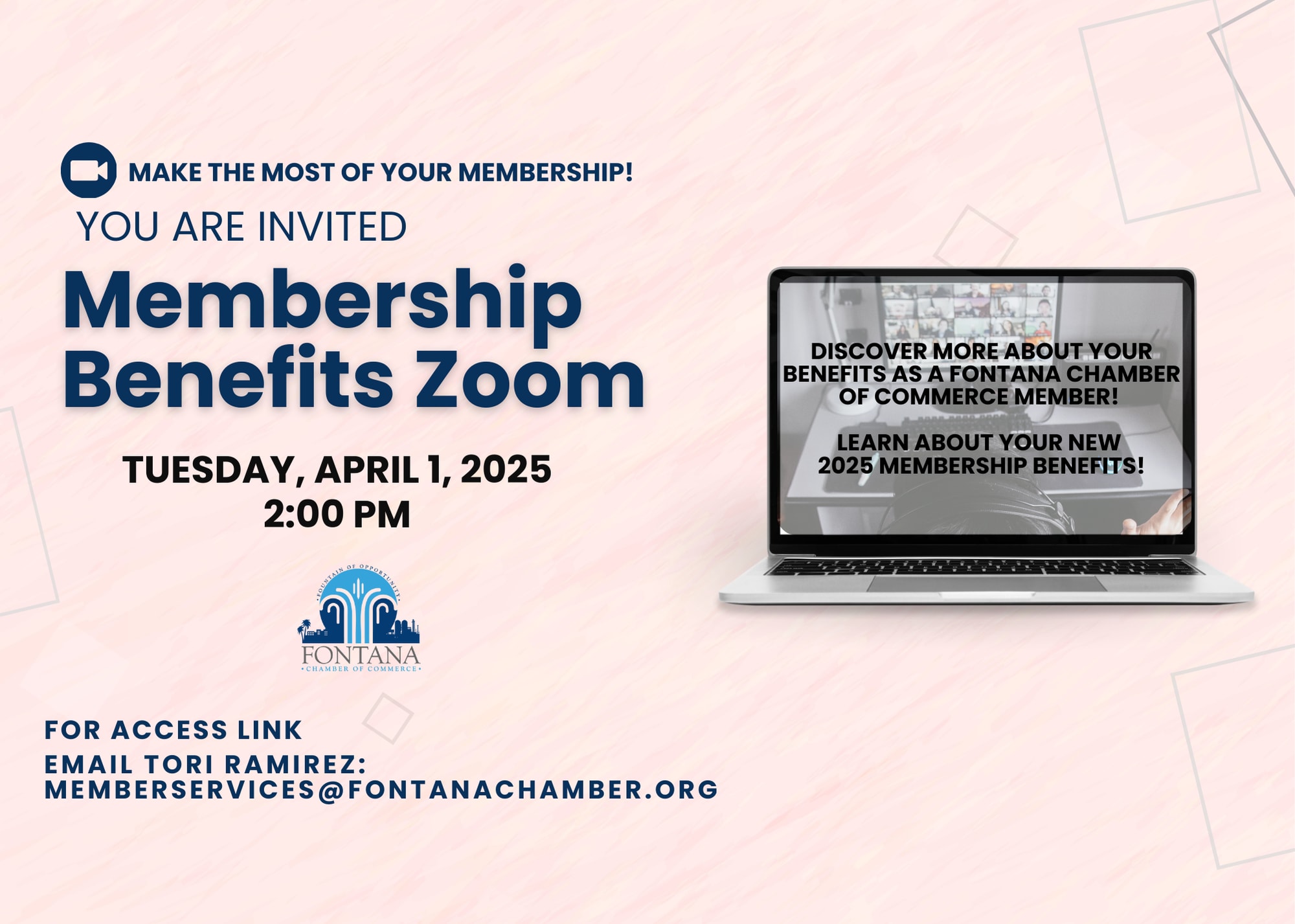 Email Tori Ramirez at Memberservices@fontanachamber.org for the link to join !Images