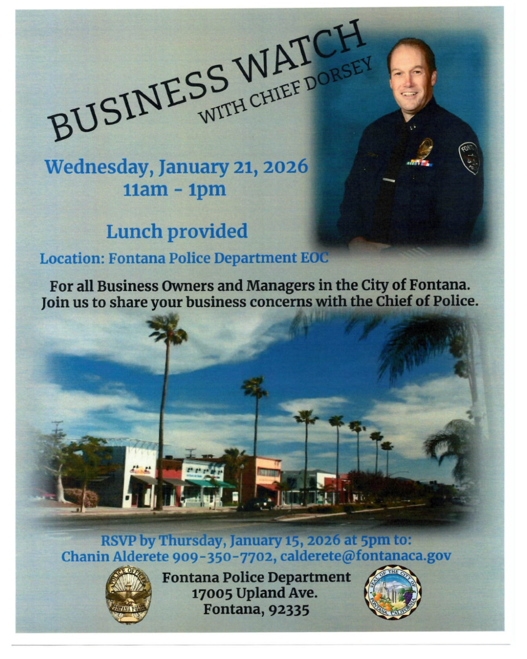For all Business Owners and Managers in the City of Fontana. Join us to share your business concerns with the Chief of Police.