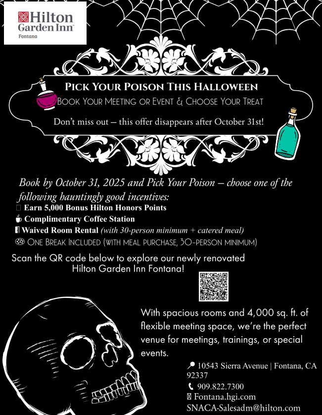 Book by October 31, 2025 and Pick Your Poison — choose one of the following hauntingly good incentives: Earn 5,000 Bonus Hilton Honors Points Complimentary Coffee Station Waived Room Rental (with 30-person minimum + catered meal) One Break Included (with meal purchase, 30-person minimum)