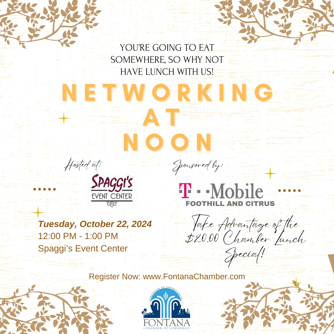 You're going to eat somewhere, so why not have lunch with us? Join us for our LAST Networking at Noon event of 2024, at Spaggi's Event Center, where the networking is great, and the food is even better!