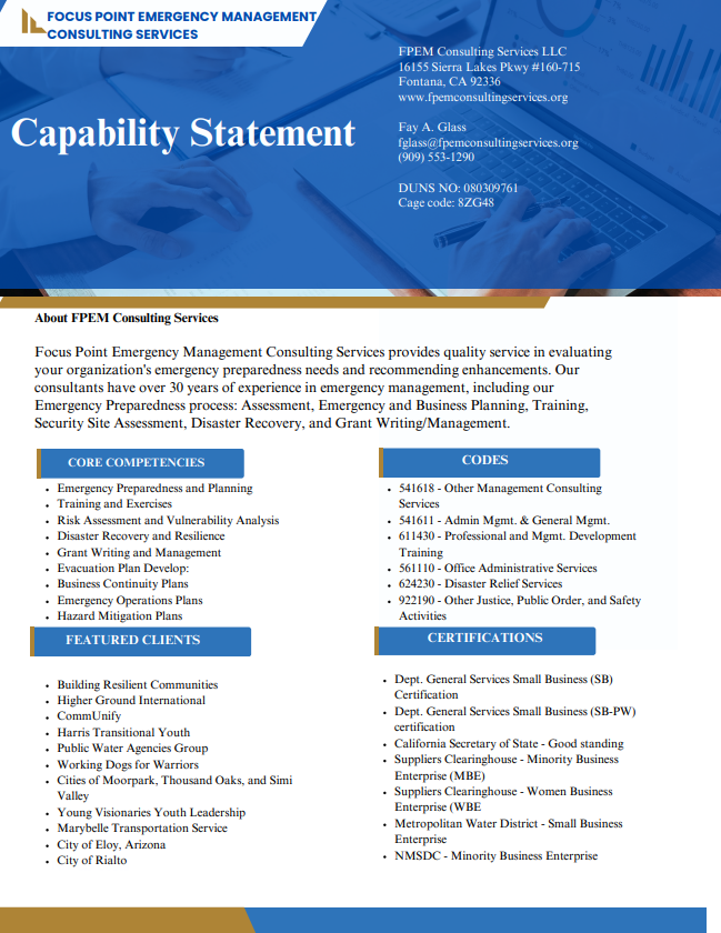 Our mission is to build a safe, secure and resilient community. To provide a comprehensive and integrated emergency management system that protects lives, property and the environment through effective mitigation, preparedness, response, and recovery services. Our Services: Assessing your organization: Emergency Plans: Disaster and Emergency Operations Plans development. Training Exercises: Includes tabletop, and drills Grant Writing: Grant Management, and grant proposals submittals.
